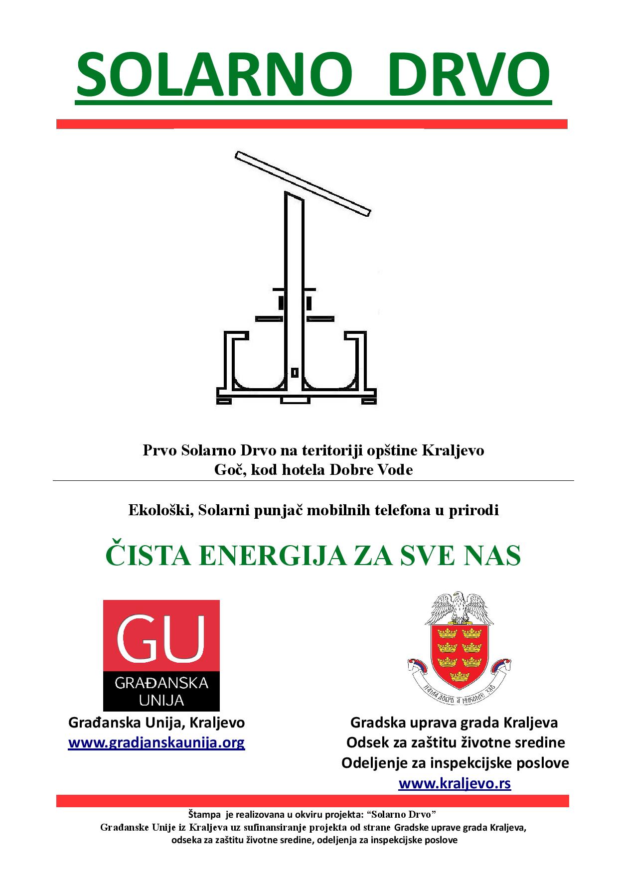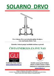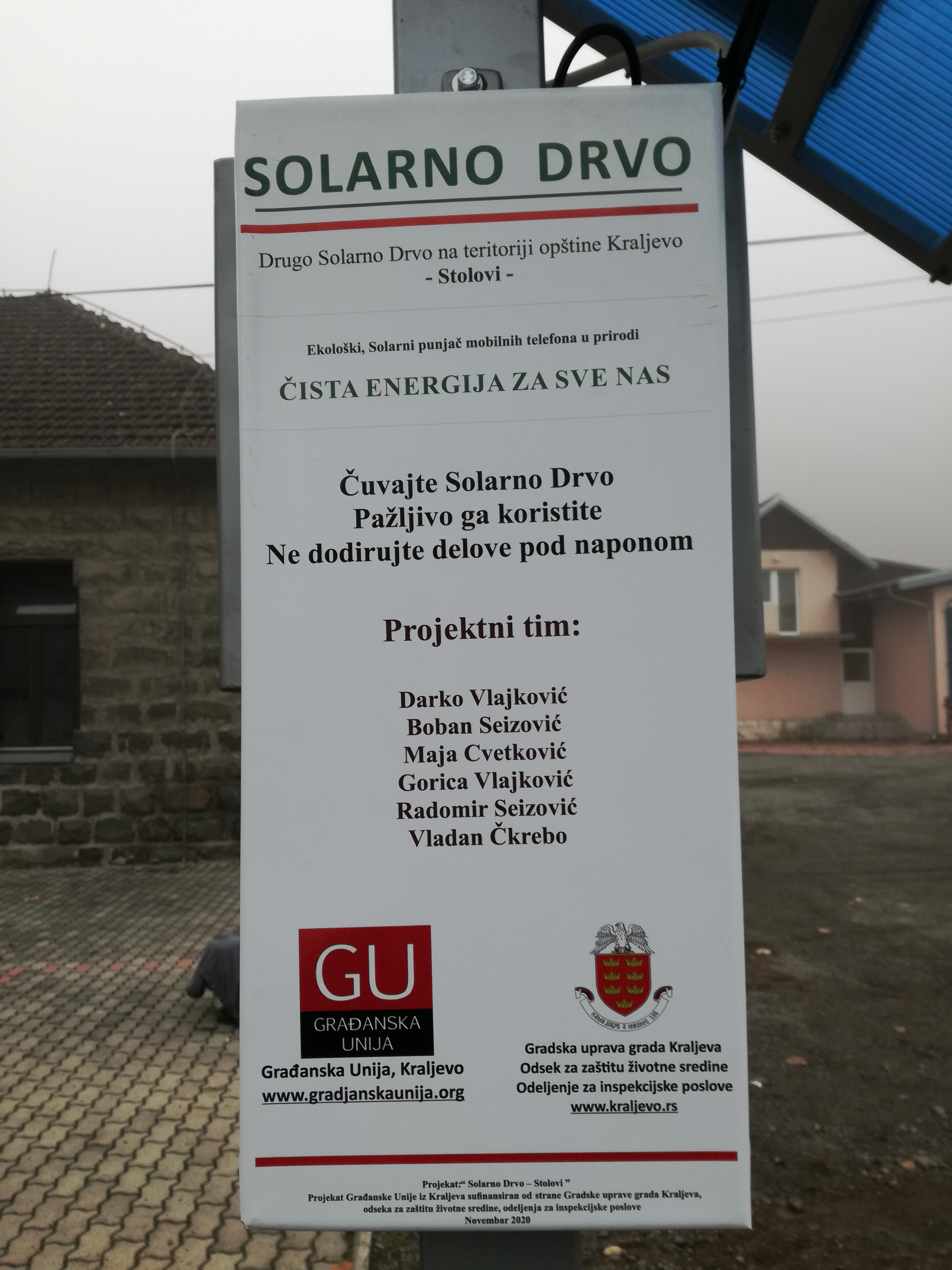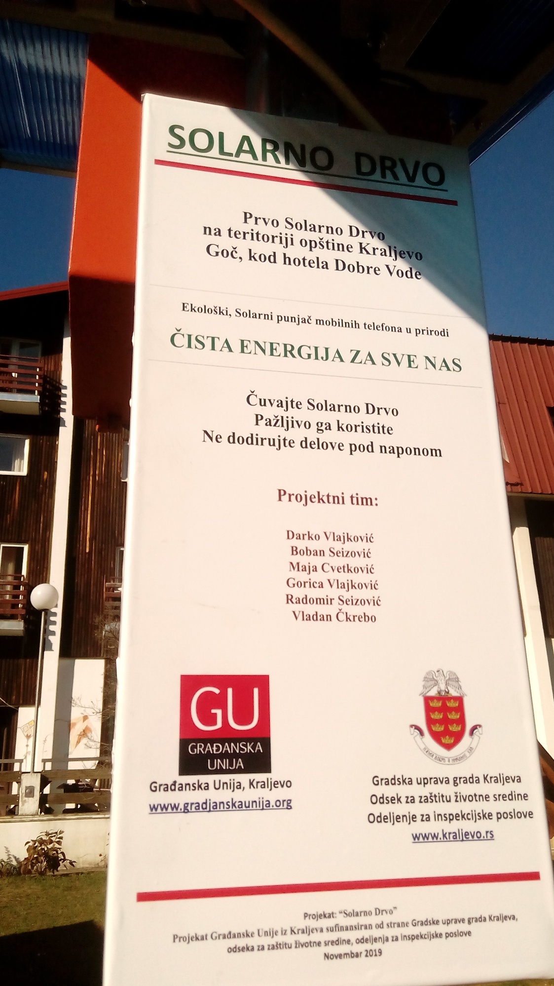 . 26.09.2019 Gradjanska Unija pocinje sporvodjenje projekta: Projekat "Solarno drvo" vidimo samo kao prvi korak pri sugestiji prvenstveno mladima da umesto provodjenja slobodnog vremena u zatvorenom prostoru, radije odu u zdravu prirodu, predivna planina Goc koja je u nasoj neposrednoj blizini i pruza bezbroj mogucnosti za nezaboravne trenutke. "Solarnim drvetom" zelimo da prvenstveno mladima, pomognemo da se lakse odluce za "napustanje svoje sobe" i da im i na cistom planinskom vazduhu "ne nedostaje" mobilni telefon, tablet ... jer sada ce i kod Hotela Dobre Vode na Gocu moci da uzivaju na cistom planinskom vazduhu i cistom solarnom energijom pune svoje "mobilne ljubimce", bez kojih - nazalost, nemogu ni tamo, ALI bolje i uz mobilni telefon na cistom vazduhu nego u zatvorenom prostoru - najbitnije je da nase sugradjane, ali i sve druge posetioce Kraljeva i okoline izvesti na cist vaduh nase planine Goc. Projekat sprovodimo u saranji i uz sufinansiranje projekta od strane Odseka za zastitu zivotne sredine, odeljenja za inspekcijske poslove, Opstine Kraljevo. Obavestavacemo Vas o daljem toku projekta. G.U. Project Team